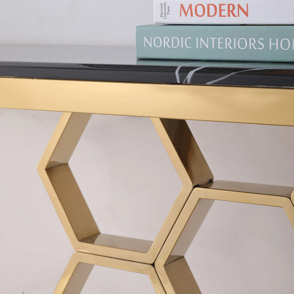 Bàn Console Hiện Đại Chân Tổ Ong – Mặt Đá Đen Vân Trắng, Khung Kim Loại Mạ Vàng Cao Cấp