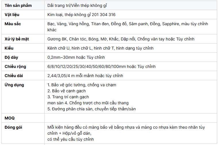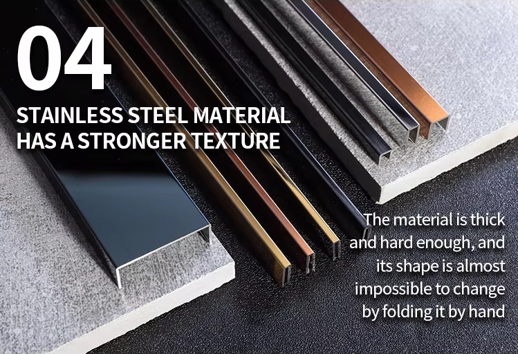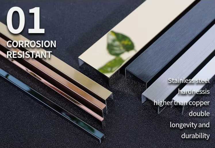 Thanh nẹp chữ U bằng thép không gỉ hiện đại mang đến nhiều lựa chọn thiết kế đa dạng với màu sắc, bề mặt , hình dạng, độ dày và kích thước tùy chỉnh. Được làm từ thép không gỉ 201, 304 hoặc 316 bền bỉ , chúng đảm bảo độ bền và vẻ ngoài bóng bẩy. Thích hợp để bảo vệ góc tường, hoàn thiện cạnh gạch, đường chuyển tiếp sàn nhà, v.v., những thanh nẹp này kết hợp chức năng với tính thẩm mỹ hiện đại. Dễ dàng lắp đặt và tính năng chống thấm nước khiến chúng trở nên lý tưởng cho cả dự án dân dụng và thương mại.